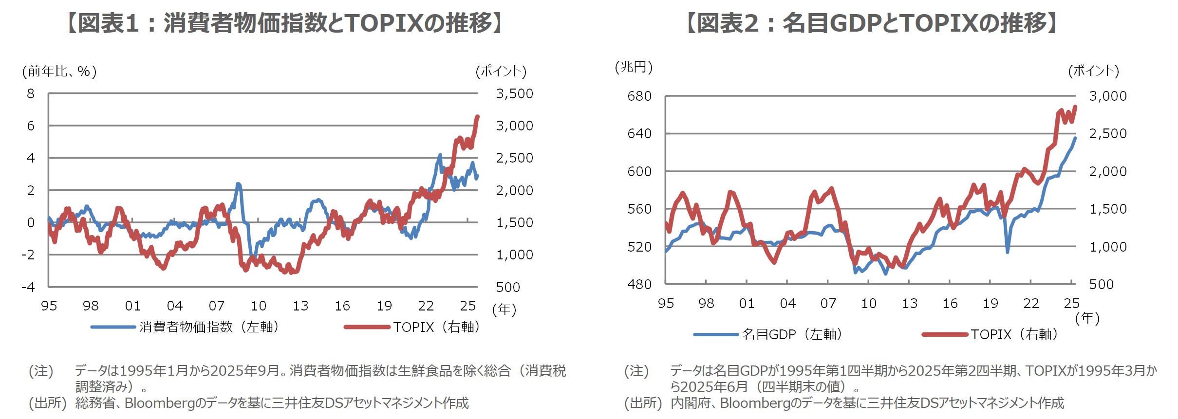 国内経済の大きな変化は、ここ数年の「物価の上昇」です。企業の売上高や利益は「名目ベース」であり、物価変動の影響を受けるため、物価の上昇は、名目ベースの売上高や利益の増加要因となります。実際、コロナ・ショックを経て、物価の上昇とともに株高が進行していることが確認され(図表1)、近年の国内物価の上昇は、株価を押し上げる1つの要素と考えられます。