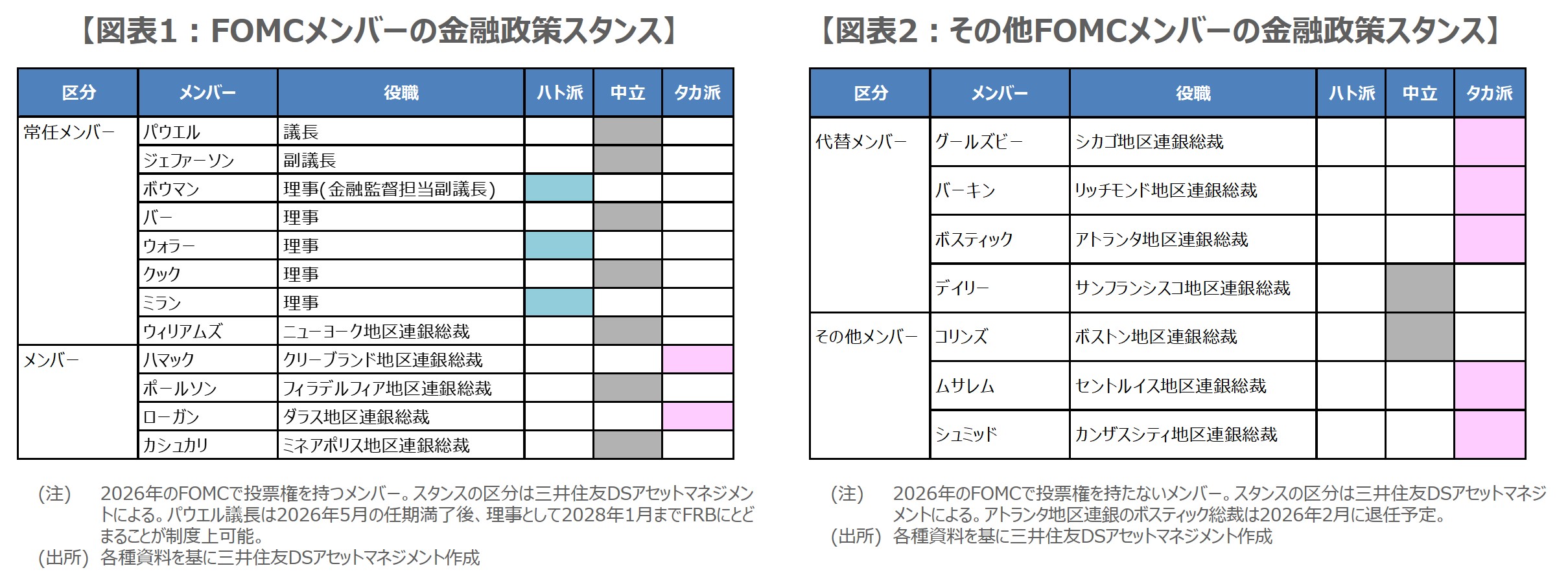 なお、2026年のFOMCで投票権を持つ12名のメンバーに加え、投票権を持たない残り7名のメンバー(図表2)についても、金融政策のスタンスは3、6、9、12月のFOMCで公表される「政策金利水準の分布図(ドットチャート)」に反映されます。さて、2026年は、1月にミラン理事の任期が満了し、2月には5年に1度のFRB理事による地区連銀総裁の任期更新の承認採決が行われ、5月にはパウエル議長の任期が満了します。