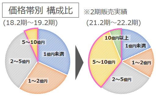 「価格帯の向上」については、プロ投資家であるファンドやREITへのアプローチを強化しつつ10~20億円規模の収益不動産の取扱いを拡充すると同時に、取扱いの中心を3億円以上の収益不動産にシフトする事で価格帯の引き上げ、案件の大型化を進めています。