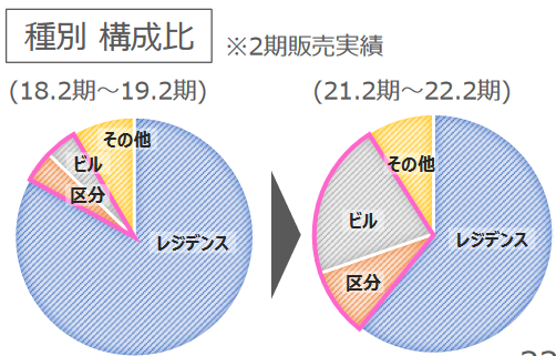 今回の決算では、稼働の止まっていた東北ホテルの売却が決まり、今期に売却収益計上が見込まれる他、東北事業の整理がついたことにより優秀な人材をコア事業である不動産販売事業に投入出来ること、更に不動産販売事業において収益性を重視した販売を徹底したことなどから、収益体質の強化が図れました。加えて、営業戦略のテーマである取り扱い案件の「大型化」「多様化」も着実に進んでいます。