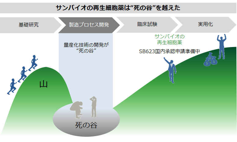 創業にあたり、慶應義塾大学 岡野栄之(ひでゆき)教授(脳神経領域の再生医療、iPS研究で世界の第一人者。現在、慶應義塾大学教授 再生医療リサーチセンター センター長、ISSCR(国際幹細胞学会)President)の研究分野に着目し、協力を願い出たところ快諾を得て、同氏の紹介もあり、2002年12月、神奈川県内の国公私立大学の研究成果を企業に橋渡しする技術移転機関「よこはまティーエルオー株式会社」から、現在の開発品の基本技術となっている基本シーズに係る知的財産の譲渡を受けた。岡野氏は創業科学者としてサンバイオの創業以来、科学的な見地からのアドバイスを提供している。一方、米国では、再生医療分野での強固なネットワークを通じて、各分野の有力なアドバイザーや、優秀な研究員を獲得し、細胞治療薬の開発、製造及び大量生産技術の確立を進めてきた。