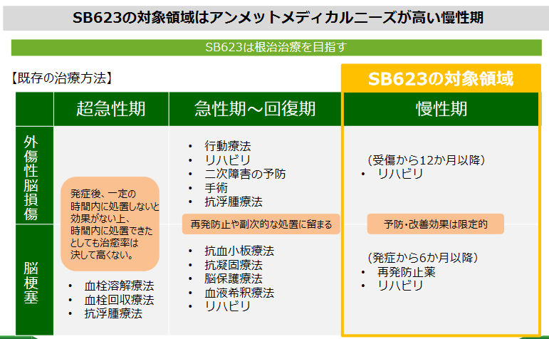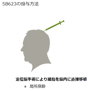 2011年1月には米国においてSB623の慢性期の脳梗塞を対象とした臨床試験(フェーズ1/2a)を開始し、2013年8月には被験者18名にSB623の投与を完了し、SB623の安全性と統計学的に有意な有効性データが確認された。
