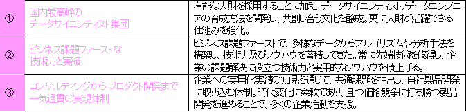 ●社内用語や業務文脈に合わせたLLMの構築支援を行い、業務効率化だけでなく、社内ナレッジ活用の高度化を実現できるノウハウ・技術力を持ったAIエンジニアが多数在籍している。