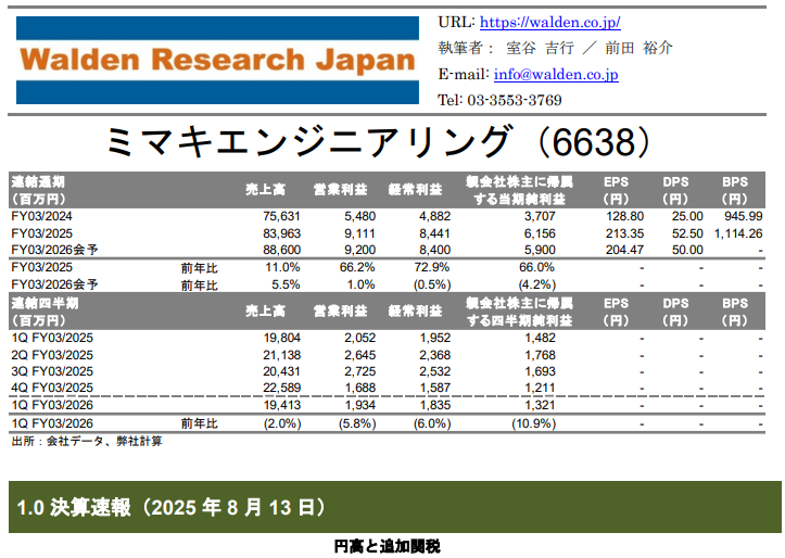 2025年8月7日、産業⽤印刷のデジタル化を推進するミマキエンジニアリングは、2026年3月期第1四半期(4-6月)の実績を発表している。円高並びに追加関税による影響が大きくなっており、前年同期との比較では減収・減益での着地を余儀なくされているのだが、円高の影響を除いた場合には増収・増益が確保できていることが明らかになっている。為替が円高に振れている分だけ売上高及び営業利益が引き下げられていることに加えて、追加関税の発動に際する不透明感を背景として北米及び欧州における売上高は、現地通貨ベースでも前年同期に対して減少している。日本における売上高は大幅に増加しているものの、両者を補うまでには至っていない。一方、安定的な収益性で売上高成長の追求を継続し、資源の積極的な活用により新たな領域にチャレンジしていくと標榜している同社は、第1四半期(4-6月)においてもこれに向けての積極的な先行投資を行っている。当該期間の動向においても新製品の投入による貢献が認められるのだが、為替や関税率といった外部環境の変化に伴う影響が一時的に大きくなっていると考えられよう。