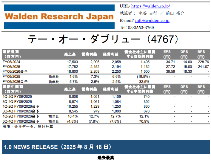 2025年8月7日、高度化された統合プロモーションのプランニング&プロデュースの展開に注力しているテー・オー・ダブリューは、2025年6月期の実績発表に引き続いて決算説明会(ライブ配信)を開催している。コロナ禍における特定のBPO業務による寄与を除いた場合、売上高及び経常利益において過去最高が更新されていることが明らかになっている。クライアントの拡張と領域の拡張の「2軸の拡張」による事業拡大を推進する施策が奏功していると考えられよう。2025年1月15日、エンターテイメントやカルチャー領域に強いデジタル制作会社Qeticを子会社化しグループ新体制を確立している同社は、イベント、映像、デジタルといった各領域において専門性の高い子会社との連携を加速し、業務のクオリティ及び収益の双方を向上させていくとしている。また、体験価値をコアに統合プロモーションやイベントのプランニング&プロデュースとの相乗効果を創出し、リアルイベント、統合プロモーション、ハイブリッドイベント、以上のそれぞれのカテゴリーにおける事業の拡大に注力していくとのことである。また、これをもって持続的な成長を達成していくとのことである。