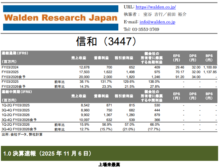2025年11月6日、建設工事現場で用いられる仮設資材の製造・販売・施工及び物流機器の製造・販売を展開している信和は、2026年3月期第2四半期(中間期)の実績を発表している。売上収益及び利益水準の双方で上場来最高が更新されていることが明らかになっている。更には、通期の会社予想が増額修正されており、期末配当も増額(16.0円 → 18.0円)されている。同社が示唆するところに鑑みれば、物流機器部門における大型物流倉庫関連案件の売上収益の増収が大きな影響を及ぼしている模様である。仮設資材部門の売上収益は前年同期との比較で概ね同水準を維持するに留まっているのだが、第3四半期(10-12月)より海津建設株式会社を新たに連結決算の対象とすることによる寄与が始まる。中期経営計画(2025年3月期~2029年3月期)の基本戦略として掲げられている通り、既存事業とのシナジー創出が期待できる M&Aが着実に実施されていると考えられよう。弊社では、同社の決算説明会(開催予定:11月25日)に出席するのに引き続いて同社の経営陣との取材を通して更なる詳細を把握することを予定している一方、その内容に鑑みて同社の「企業レポート」を更新し改めてリリースすることを計画している。