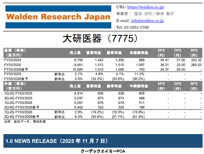 2025年10月31日、病院内感染防止及び術後疼痛管理に用いられる医療機器の研究開発・製造・販売を展開している大研医器は、2026年3月期第2四半期(中間期)の実績を発表している。画期的な特性をもって術後疼痛管理に用いられるクーデックエイミーPCAの販売が好調に推移していることが明らかになっている。また、病院内感染防止に用いられる、従来からの主力製品であるフィットフィックスにおいても増収が達成されていることから第2四半期(中間期)における同社は前年同期に対する増収を確保している。ただし、損益面においては、材料コストの上昇や研究開発費の増加に伴う影響がより大きくなっていることから同社は減益を余儀なくされている。一方、中長期的な観点においては、クーデックエイミーPCAによる寄与が持続的な右肩上がりでの推移を示し、同社としての成長力を大きく引き上げていくことが想定されている。既存の日本国内の市場において大きな拡販余地が残されていることに加えて、欧州をはじめとする海外市場での発売並びに拡販が計画されている。