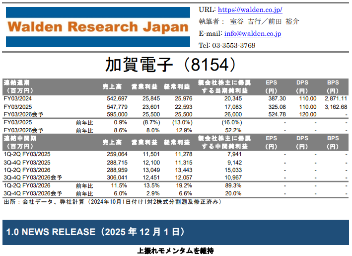 2025年11月27日、電子部品商社大手の加賀電子は2026年3月期第2四半期(中間期)の決算説明会をWeb開催している。第1四半期(4-6月)に引き続いて第2四半期(7-9月)においても、前年同期に対して増収・増益が達成され、当初の会社予想に対する上振れモメンタムが引き続いていることが明らかになっている。第2四半期(7-9月)においては、同業の協栄産業を子会社化していることに伴う増収・増益も発生しているのだが、このインパクトを除いた場合においても前年同期に対する増収・増益が達成されている。第1四半期(4-6月)の実績発表に際しては、上振れ幅は反映せず上述の子会社化のみを織り込んで通期の会社予想を修正し、期初の「減収・減益」予想から「増収・増益」予想へと増額修正されている一方、第2四半期(7-9月)の実績発表に際する増額修正においては第2四半期(中間期)における上振れ幅を反映しているとのことである。同社によれば、創業 60 周年(2028年3月期)には売上高 1 兆円企業となることを見据えている現行の中期経営計画(2026年3月期~2028年3月期)の成長戦略に沿った順調な業績進捗が達成されているとのことである。