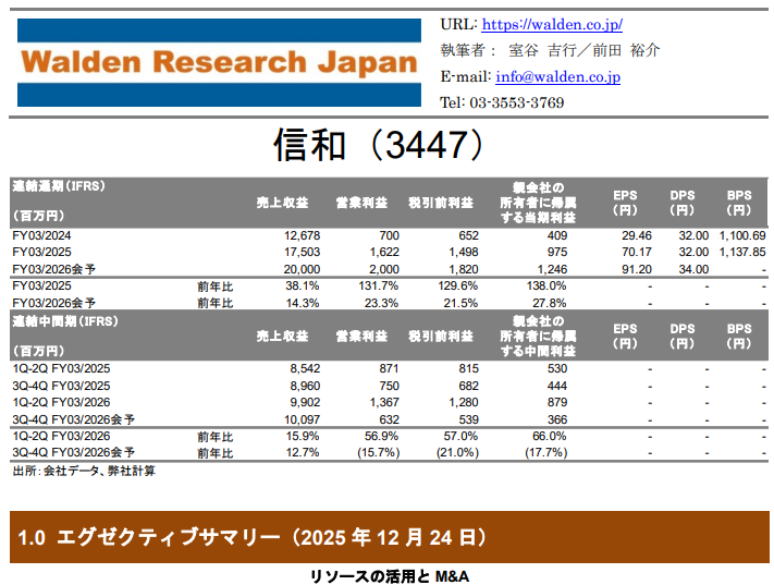 建設工事現場で使用される仮設資材(足場)の製造・販売・レンタル・施工サービス及び物流機器の製造・販売を展開している信和においては、⼤型物流倉庫関連案件による寄与が大きく拡大していることから2026年3月期第2四半期(中間期)に対して売上収益及び利益水準の双方で上場来最高が更新されている。また、これに引き続いて、中長期的な観点においても着実な成長を達成していける方向性が示されている。既存の中期経営計画(2026年3月期~2029年3月期)における最終年度である2029年3月期に対して見込まれている売上収益20,000百万円を、早くも2026年3月期において達成できる見込みとなった同社は、既存の中期経営計画を修正することを検討するに至っている。成長戦略として「グループ内リソースの活⽤とM&Aにより、事業領域・サービスを積極的に拡⼤する」を掲げる同社は、2024年4月にヤグミグループを子会社化しているのに引き続いて、2025年5月に株式会社凰金属工業を子会社していることに加えて、2025年10月には海津建設株式会社を子会社している。また、将来に向けては更なるM&Aの実施も視野に入れている一方、これをもって創出されるシナジーの追求などを通して、2029年3月期以降に向けての確実な成長と飛躍の足場固めを達成するとしている。