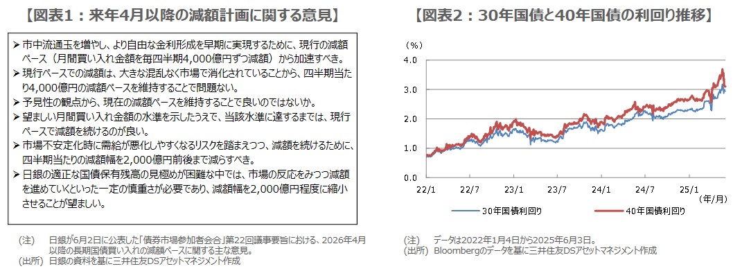 なお、国内の債券市場では先月、30年国債利回りと40年国債利回りが過去最高水準まで上昇するなど、超長期国債の利回りは歴史的な高水準が続いています(図表2)。参議院選挙を控え、消費税減税を巡る議論が活発になっており、財政規律の緩みに対する懸念が超長期国債の利回り上昇(価格は下落)の一因と推測されますが、日銀が今月の会合で何らかの対応をとるのではないかとの声も一部に聞かれます。