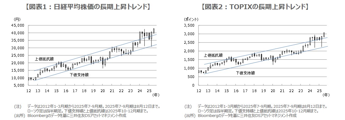 日経平均、TOPIXとも、ここ10年以上、長期上昇トレンドが続いているため(図表1、図表2)、前述のように、相場の過熱感から、いったん調整売りに押された場合でも、このトレンドが崩れる恐れは小さいとみています。なお、両指数とも上値抵抗線をすでに上抜けているため、より右肩上がりの上昇トレンドが形成されつつあるとも考えられますが、長期チャートのため、その判断にはもう少し時間が必要と思われます。