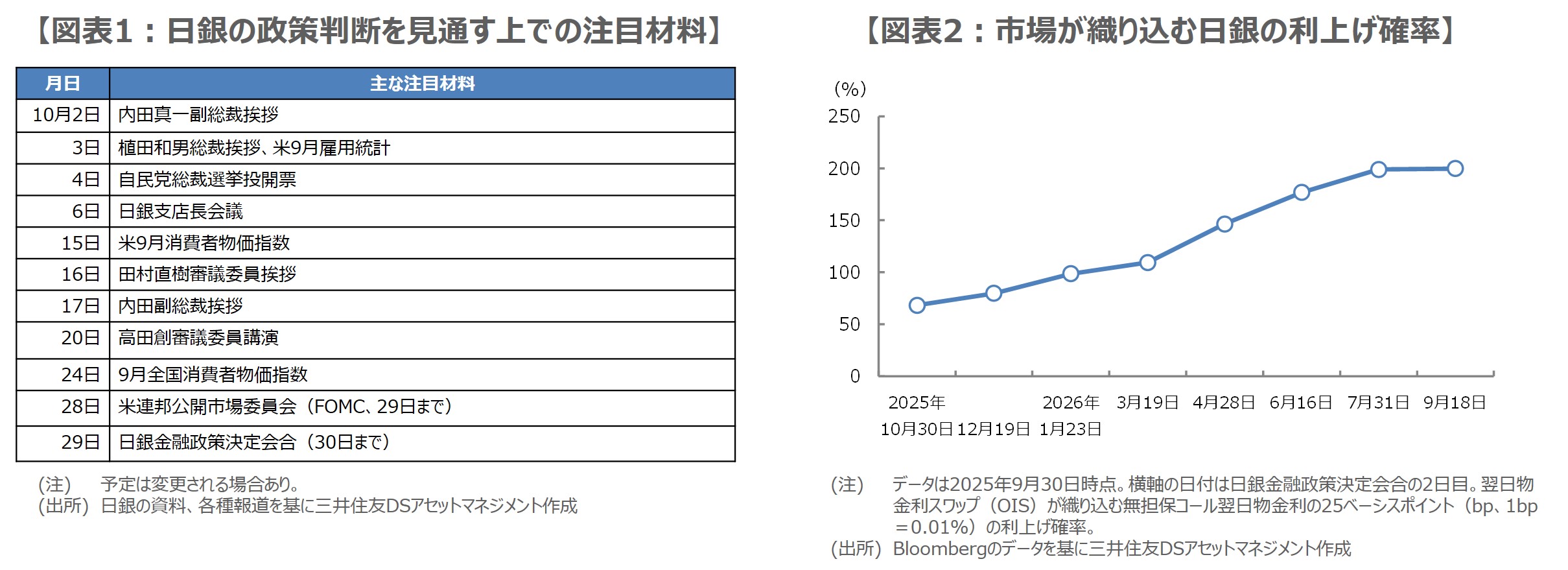 日銀金融政策決定会合の開催が10月29日、30日に控え、市場では追加利上げを巡る思惑が徐々に強まっています。今週以降、複数の日銀政策委員の発言や、日米の重要な経済指標などが予定され、日銀の政策判断を見通す上での注目材料が目白押しとなっています(図表1)。そこで今回のレポートでは、主な材料のポイントを整理し、10月会合での利上げの可能性について考えます。