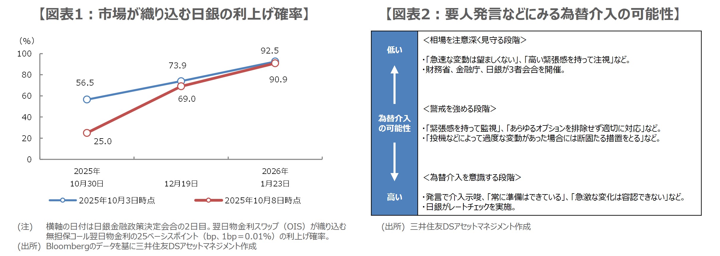 市場では日銀による早期利上げ観測が後退し、25ベーシスポイント(bp、1bp=0.01%)の利上げが今月実施される確率は、10月3日時点で56.5%まで織り込まれていましたが、8日時点では25.0%へ低下しています(図表1)。このような状況のなか、円は幅広い通貨に対して減価が進み、10月3日から8日までの期間、主要33通貨に対し、全面安となっています。