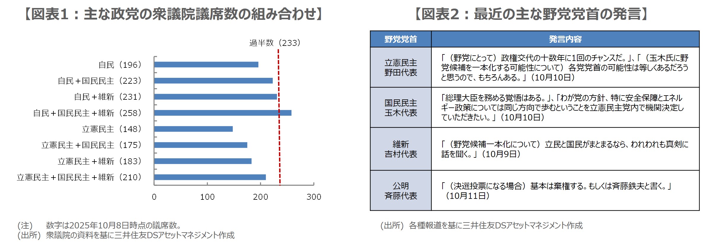 衆議院の定数は465議席であり、過半数は233となります。10月8日時点の衆院会派の議席数は、自民党が196、立憲民主党が148、日本維新の会が35、国民民主が27、公明党が24です。野党が統一候補を立てることができなければ、196議席を有する自民党の高市氏が勝利し、単独少数与党の政権が発足する公算が大きくなります。一方、立憲民主、維新、国民民主がまとまれば210議席となり、政権交代の可能性が高まります(図表1)。