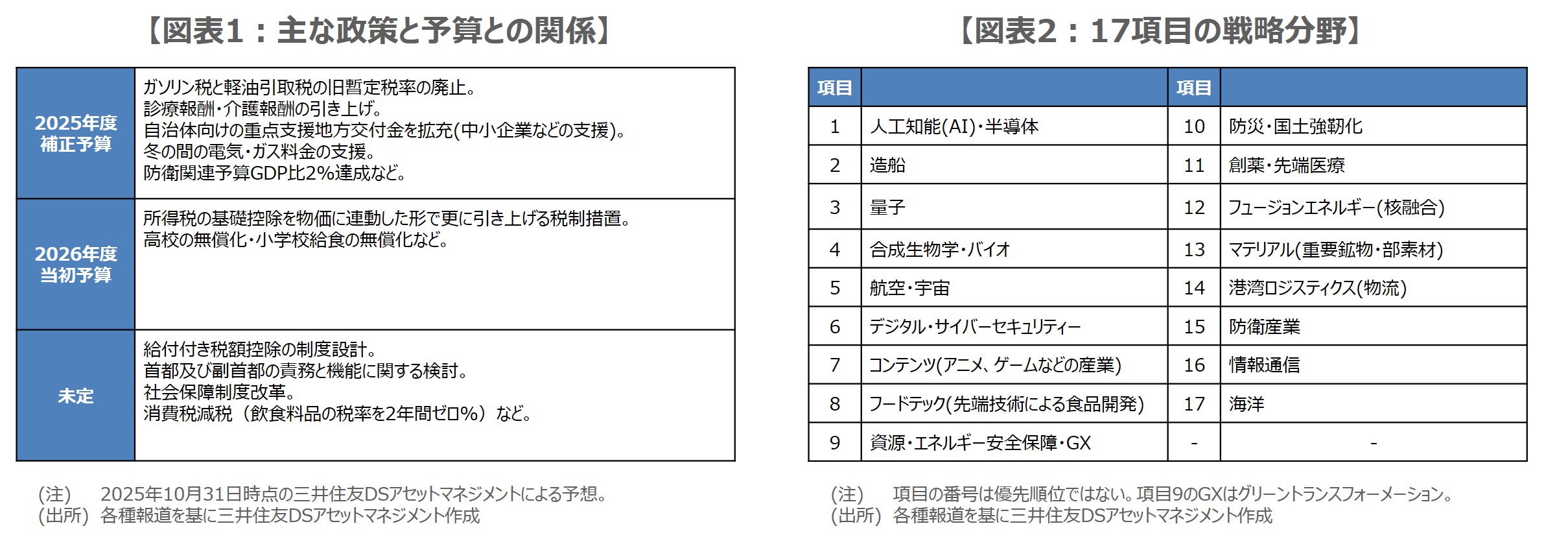 - 高市政権は、戦略的に財政出動を行うことを基本方針とし、物価高対策を最優先に位置付ける。