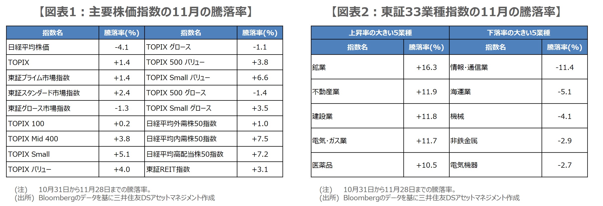 業種別では、4月から大きく上昇していた情報・通信業などが11月は下落し、出遅れていた医薬品などが上昇しました。また、総じて大型よりも小型、グロースよりもバリュー、外需よりも内需のパフォーマンスが好調で、配当や分配を選好する動きもみられました。この先、米AI相場の調整が再び強まるような局面において日本株を見通す場合、今回のような動きが参考になると思われます。