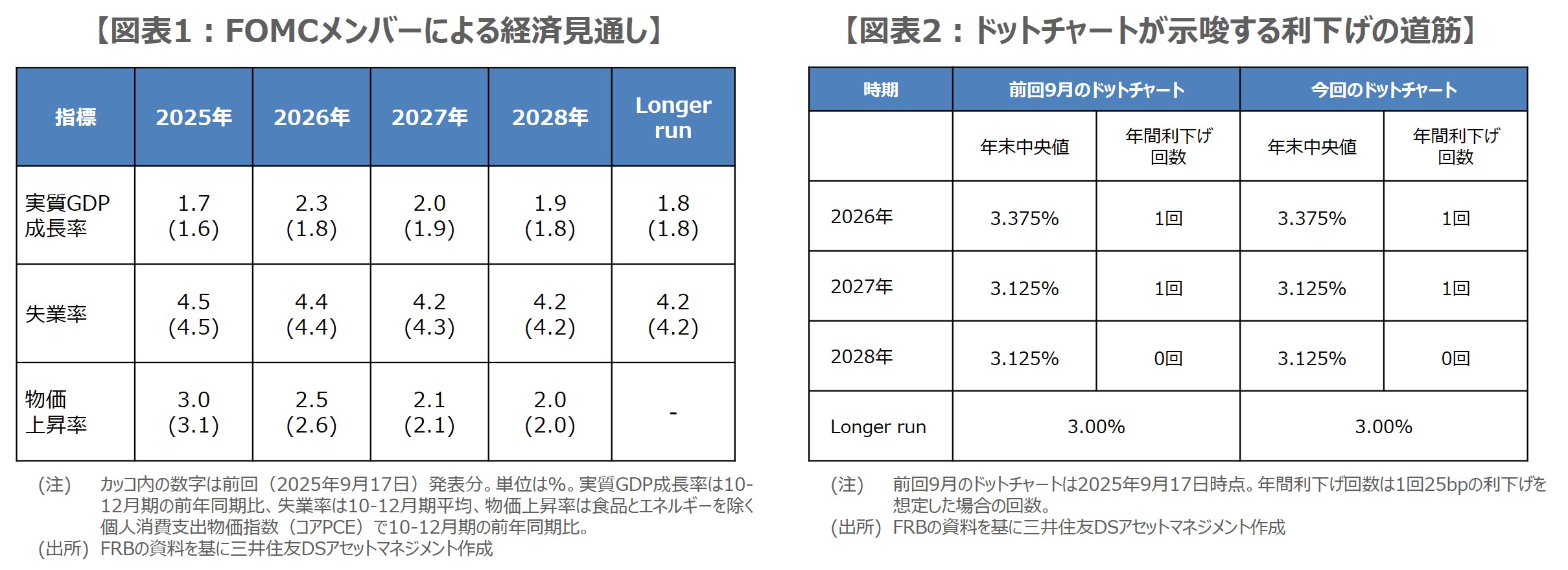 政策金利水準の分布図(ドットチャート)では、メンバーが適切と考える25bpの利下げ回数は、弊社の予想通り、9月と同じ結果になりました(図表2)。なお、2026年のドットの分布をみると、25bpより大幅な利下げを想定するメンバーは8名、25bpの利下げが4名、据え置きが4名、25bpの利上げが3名と、大きく見解が分かれました。ただ、19名のうち、12名は利下げが適切と考えており、全体では利下げ予想が多いことになります。