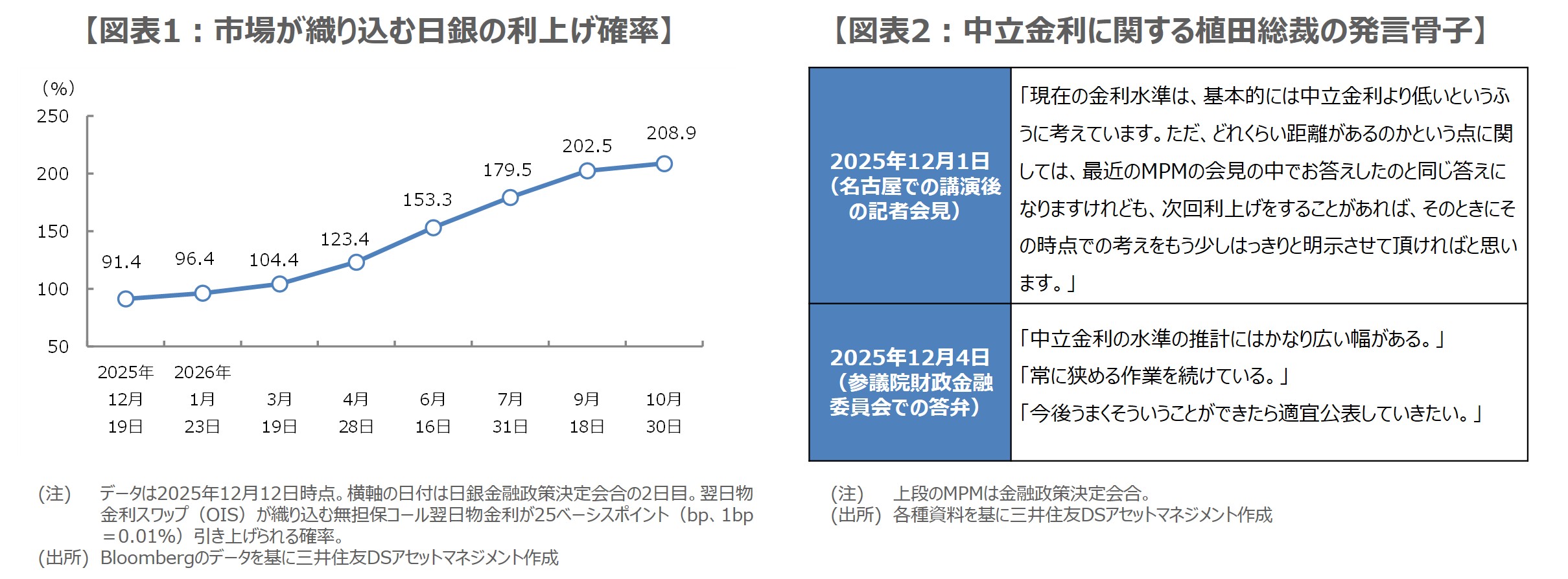 日銀は12月18日、19日に金融政策決定会合を開催します。弊社は無担保コール翌日物金利の誘導目標(現行0.50%程度)について、今回、25ベーシスポイント(bp、1bp=0.01%)の利上げを予想しています。すでに複数のメディアから、利上げについての観測報道が伝わっており、市場でも今会合における25bpの利上げはほぼ織り込み済みとみられます(図表1)。