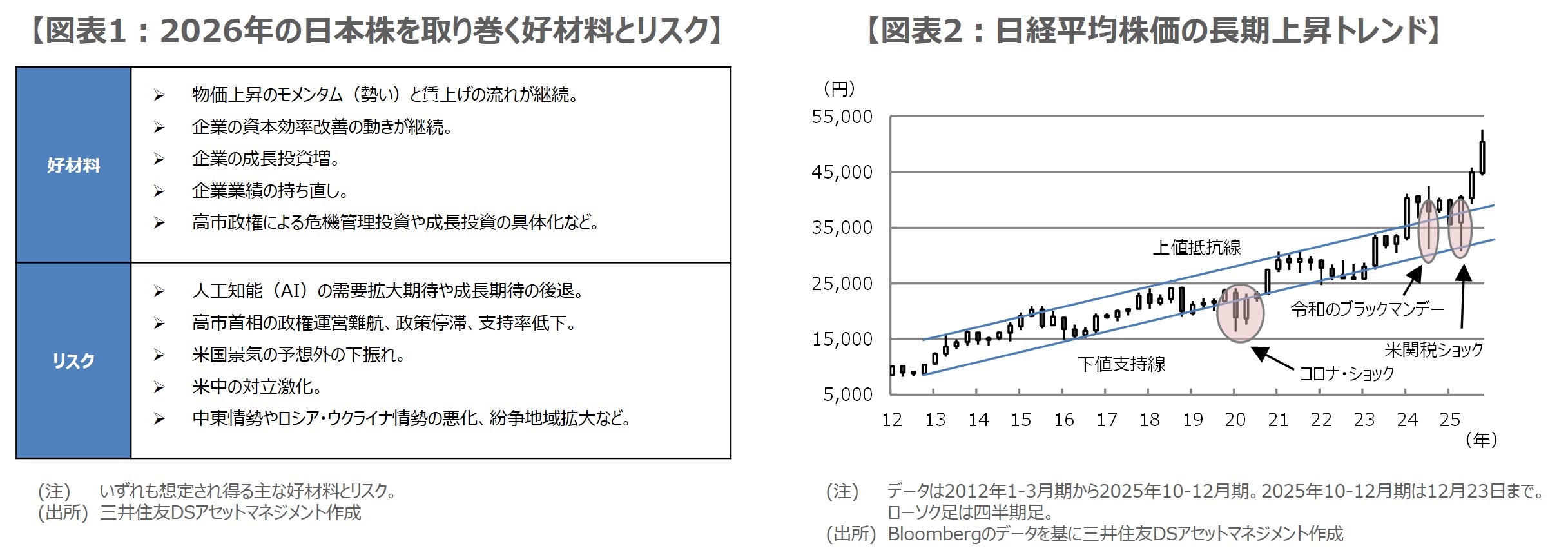 2026年の日本株を取り巻く好材料とリスクをまとめたものが図表1で、リスクについては特にAI相場への期待が揺らぐ材料には注意が必要と思われます。なお、日経平均は2012年以降の長期上昇トレンドの上値抵抗線をすでに上抜けており、より右肩上がりの上昇トレンドが形成されつつあります(図表2)。この点を踏まえると、2026年に多少大きめの調整が発生しても、長期上昇トレンド自体が大きく崩れる恐れは小さいと考えられます。