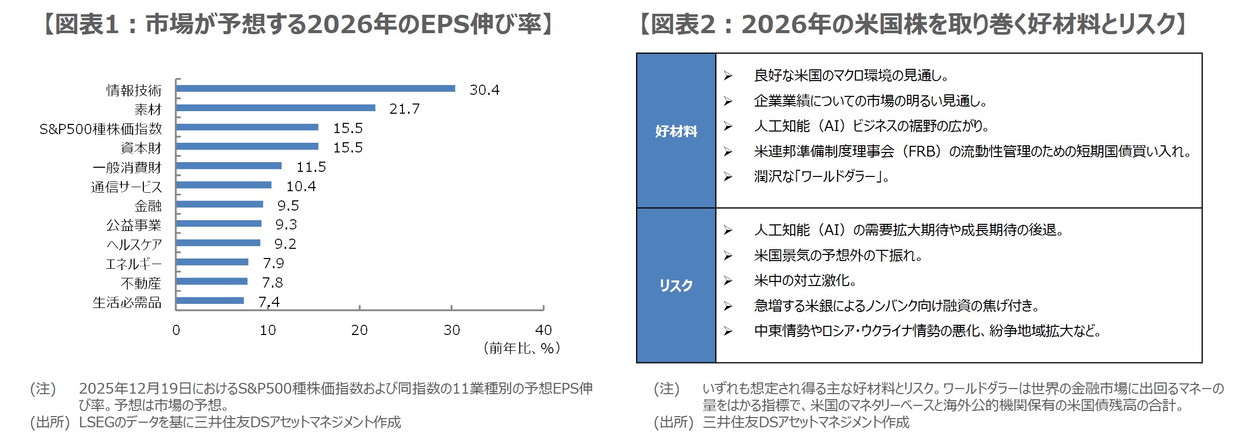 企業業績も市場の見通しは明るく、2026年の1株あたり利益(EPS)の伸び率について、S&P500種株価指数全体では直近で前年比+15.5%となっています(図表1)。業種別では、一般消費財(アマゾン、テスラなど)が同+11.5%、情報技術(アップル、マイクロソフト、エヌビディア、主要半導体企業など)が同+30.4%、通信サービス(グーグルの持ち株会社アルファベット、メタなど)が同+10.4%と、いずれも2ケタの伸びが予想されています。
