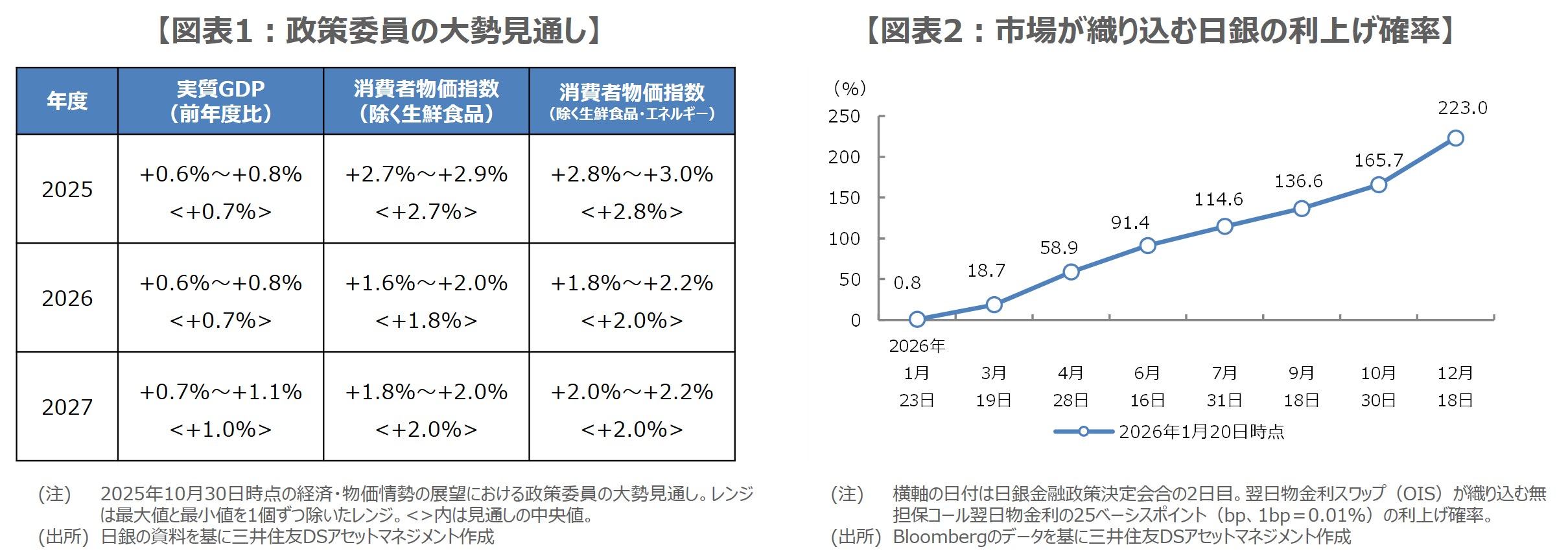 まず、展望レポートについて、実質GDP成長率は、2025年度が昨年12月の基準改定の影響で、2026年度は総合経済対策を受け、それぞれ前回(図表1)から上方修正が見込まれます。また、物価高対策で2026年度の物価見通しは下方修正が予想されます。リスクバランスの評価は前回、経済の見通しが「2026年度は下振れリスクの方が大きい」、物価は「概ね上下にバランスしている」でしたが、これらに変化があるか否かも注目されます。