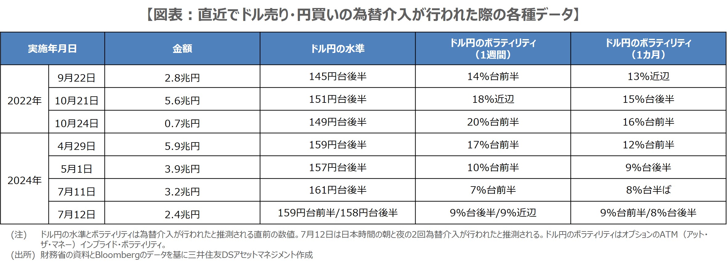 なお、直近でドル売り・円買いの為替介入が行われたのは2022年と2024年です。それぞれについて、為替介入の実施日や金額などを図表にまとめました。今回の局面で、為替介入実施のタイミングを考えるにあたっては、2024年のケースが有効と思われ、ドル円は157円台後半を超えてドル高・円安が進行した場合、ボラティリティは1週間で7%前半を超えて上昇した場合、1カ月で8%台半ばを超えて上昇した場合は、要注意と考えられます。