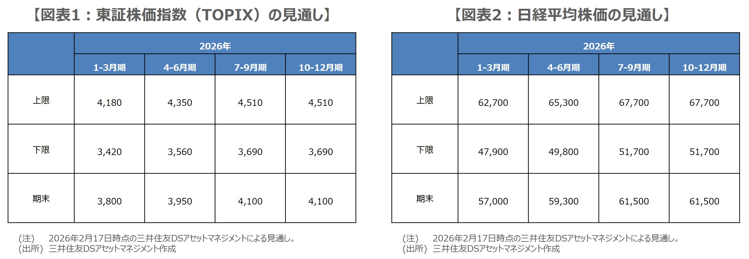 - 2026年末の新たな着地水準についてTOPIXは4,100ポイント、日経平均は61,500円を予想。