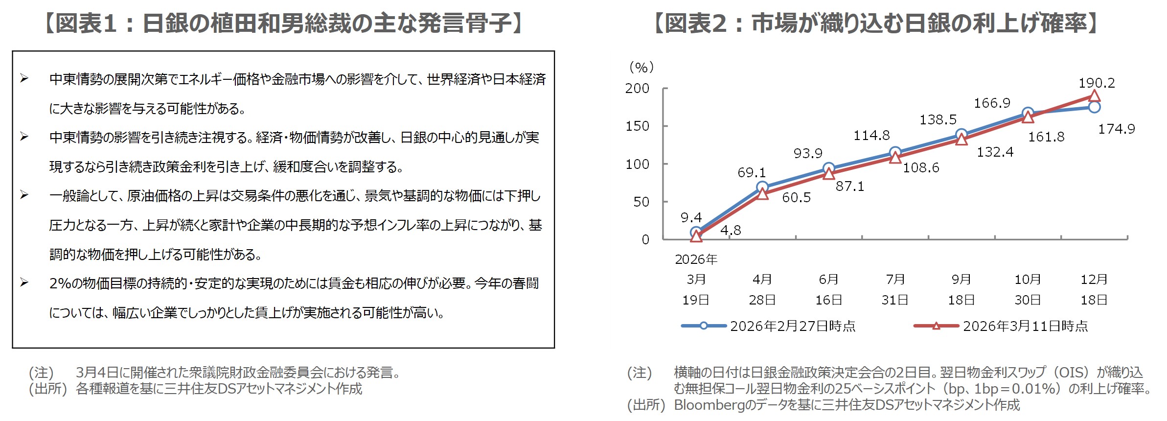 米国・イスラエルとイランの交戦がいつまで続くか、原油相場がいつ安定するかは、極めて見通しにくい状況です。こうしたなか、日銀の金融政策を考えるにあたっては、前述の3月18日の春闘集中回答日や、4月1日発表予定の日銀短観、そして4月上旬の支店長会議を通じ、高い賃金の伸びが確認されるか、原油高が企業の景況感や地域経済にどの程度影響しているか、これらの見極めが重要になると思われます。