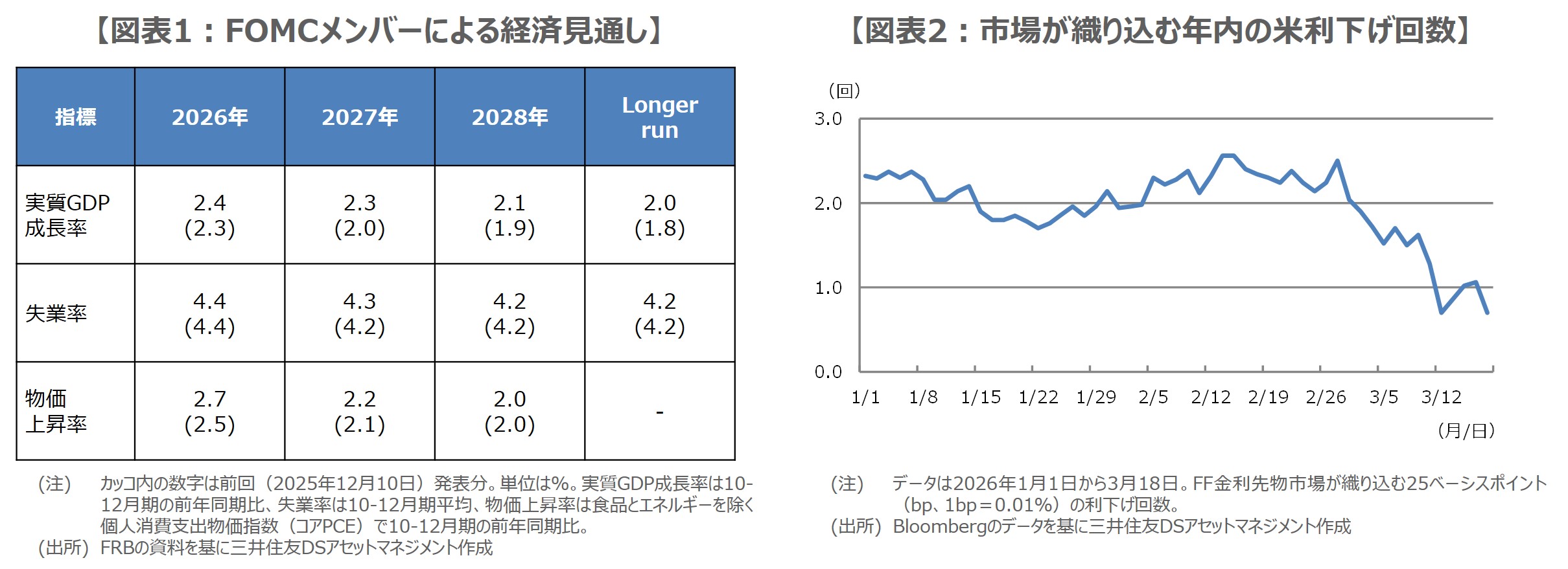 FOMCメンバーによる最新の経済見通し(SEP、Summary of Economic Projections)については、2026年の実質GDP成長率の上方修正は予想外で、2027年以降も引き上げられていることから、経済成長に強気の見方が確認されました(図表1)。失業率はほぼ変わらずとなり、個人消費支出(PCE)物価指数の伸び率は、食品とエネルギーを除くコア指数の直近の堅調な伸びを反映し、上方修正されたと思われます。