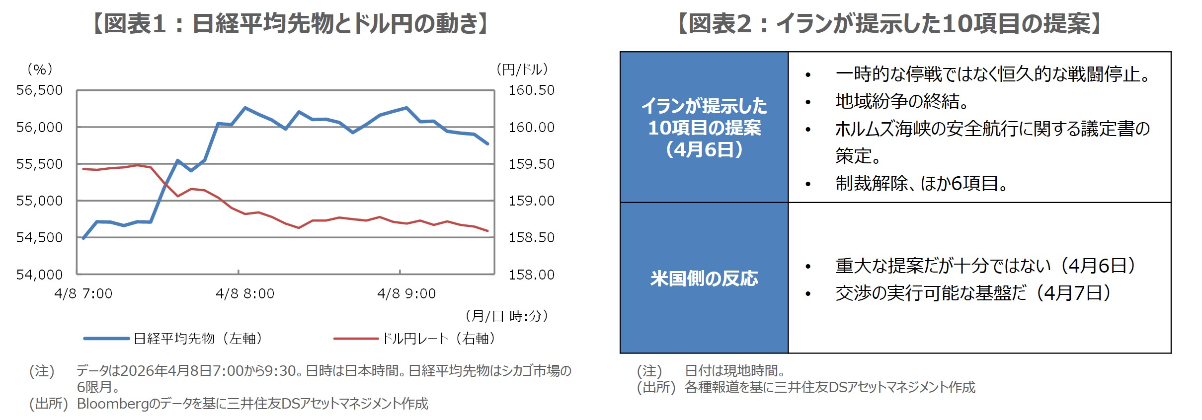 これら一連の流れを受け、日本時間4月8日の朝方、WTI原油先物価格は一時1バレル=91ドル台まで低下し、日経平均株価の先物(シカゴ市場、6限月)は急騰、一時56,000円台を回復しました。為替市場でも、米ドルが主要通貨に対し全面安となり、ドル円は一時1ドル=158円50銭台までドル安・円高が進むなど、中東情勢を巡るリスク回避の動きが大きく後退しました(図表1)。