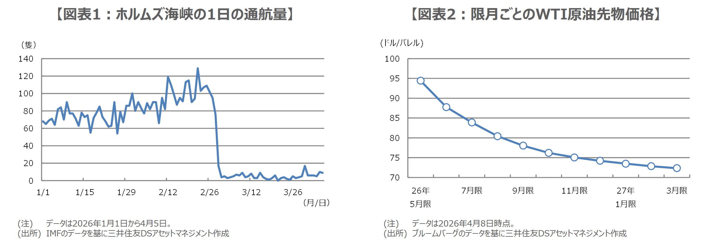 ホルムズ海峡の通航量は、米国とイスラエルがイランへの攻撃実施を発表した2月28日以前は、1日で100隻を超える日もみられましたが、翌3月1日から通航量は激減し(図表1)、日本経済新聞によると、4月8日の午後8時(世界標準時)時点でも3隻だけとなっています。改めてWTI原油先物価格に目を向けると、日本時間9日朝方の時間外取引では、97ドル88セントまで値を戻しています。