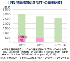この輸入停止措置は、東京電力福島第1原子力発電所の処理水の放出を理由に2023年8月に取られた措置で、2025年6月に再開が発表されたばかりでした。中国は、同措置が取られる前の2022年時点で、対象とされる品目の輸出総額の2割強を占める主要輸出先であったため、禁輸措置導入後、それらの品目の輸出量は大幅に減少しています【図3】。今回の措置は、今後の輸出量の回復への期待に水を差す形になりました。