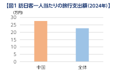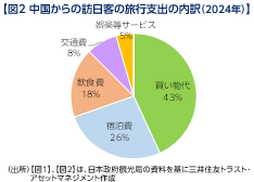 中国政府は、すでに中国国民に日本への渡航自粛を要請していますが、中国からの訪日客減少が日本経済に大きな影響を与えうることは言うまでもありません。中国からの訪日客数は全体の2割程度(2024年)を占める上、一人当たり旅行支出額も、全体平均を2割程度上回っています【図1】。また、旅行消費に占める買い物代の割合が高いという特徴もあります【図2】。そのため、中国からの訪日客数の減少は、日本各地の観光需要の減少のほか、百貨店などの売上高にもマイナスの影響を及ぼす可能性が考えられます。