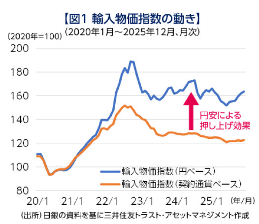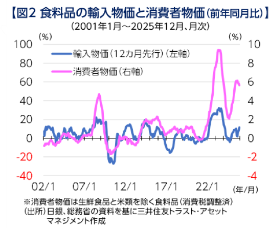 今年に入り、為替の円安・米ドル高傾向が一段と強まりました。これは1月23日召集の通常国会の冒頭での衆議院解散を巡る報道を受けた動きで、一時、2024年7月以来の159円台半ばまで円安が進みました。円安は円建ての輸入価格を上昇させるため【図1】、円安が進むと、輸入物価の上昇を通じた消費者物価への影響に対する関心が高まります。特に、日々の生活に直結する食料品価格などへの影響は、誰もが気になるところでしょう。
