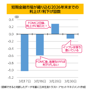 例えば3月18日、FOMC後の記者会見でパウエル氏が「インフレ抑制に進展がなければ利下げはしない」と述べると、前日に約1.0回だった年内利下げの織り込みは約0.6回まで縮小しました(下図)。そして、2日後の3月20日に利上げを織り込む姿に転じました。一方、3月30日にパウエル氏は「(資源価格が高騰しているにもかかわらず)インフレ期待は落ち着いている」と述べました。すると今度は利上げ織り込みが剥落し、金融市場は利下げを改めて織り込むようになりました。